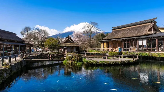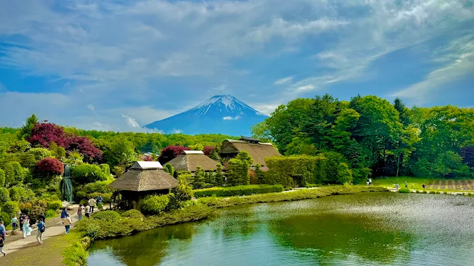 A thatched-roof craft hamlet under Fuji’s gaze, with studios for pottery, weaving, and folk art. You wander wooden lanes and step into homes reborn as workshops.