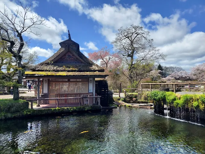 Spring-fed ponds as clear as glass, fed by Fuji’s snowmelt beside rustic thatch and gardens. You watch water bubble up blue while carp drift over bright pebbles.